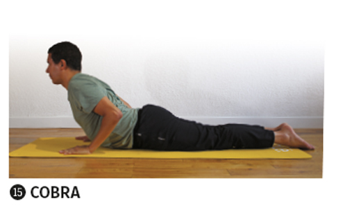 Au prochain expir, glissez-vous en avant, allongez-vous. Posez les mains au sol, en dessous des épaules. En inspirant, levez la tête, levez le buste en Cobra.